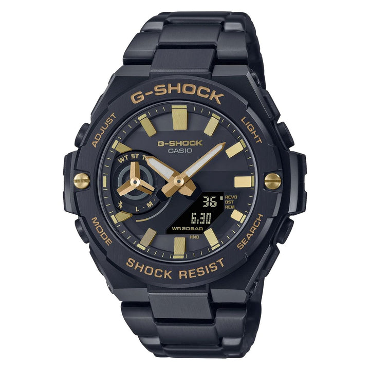 Tough construction meets stylish design with metal bezel ion-plated in gold set against a black base. This sophisticated fashion statement with a luxury feel and cool look takes you where you want to go.