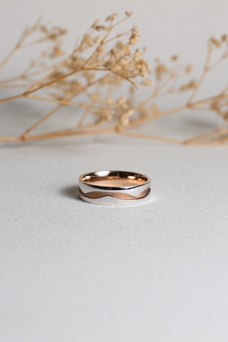 Our modern Monte band is finely crafted from 9ct rose gold with a 9ct white gold overlay. A mountain-inspired pattern is etched into the 6mm band and runs the entire way around it. Choose this ring to celebrate your unique love.