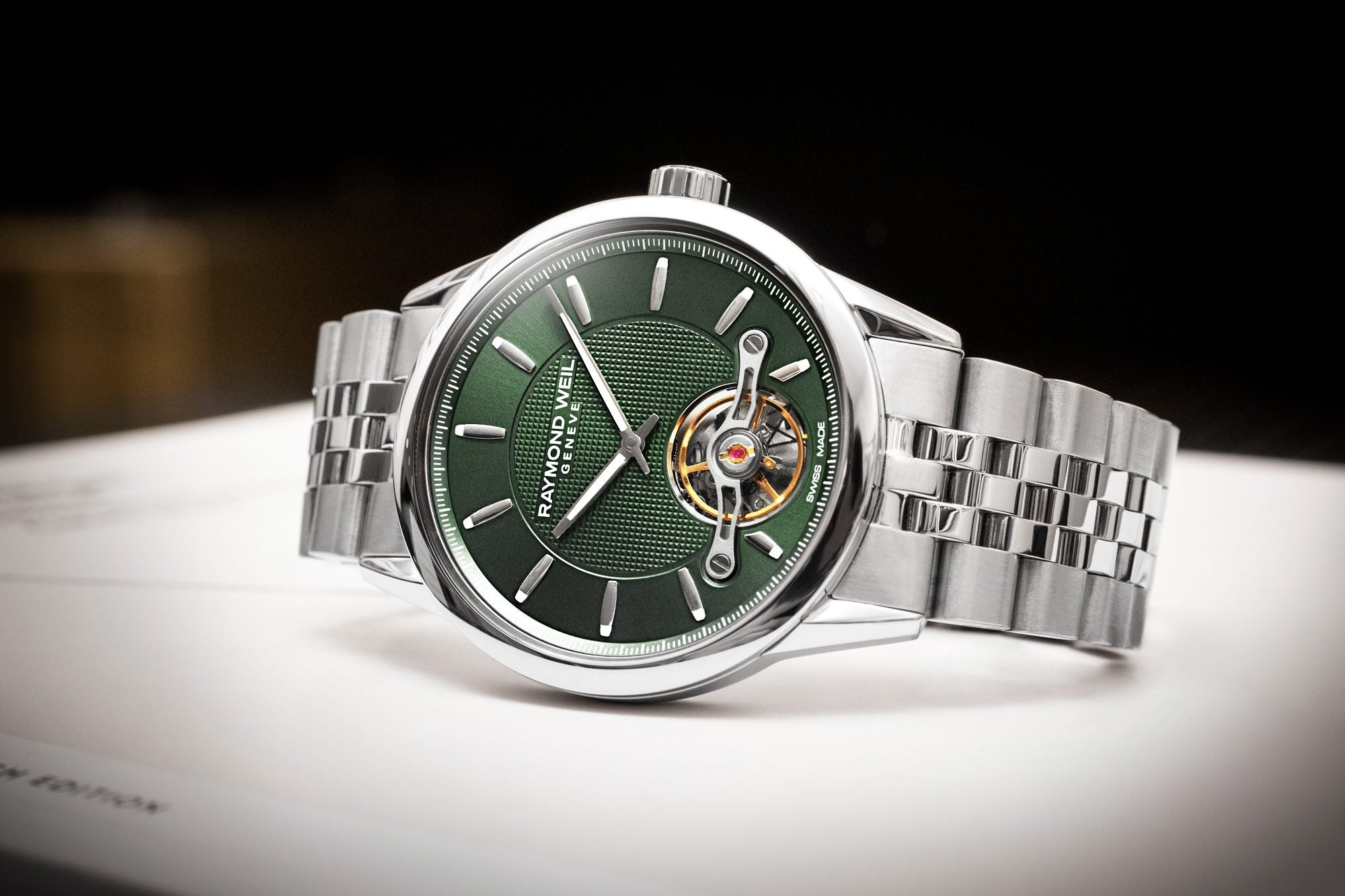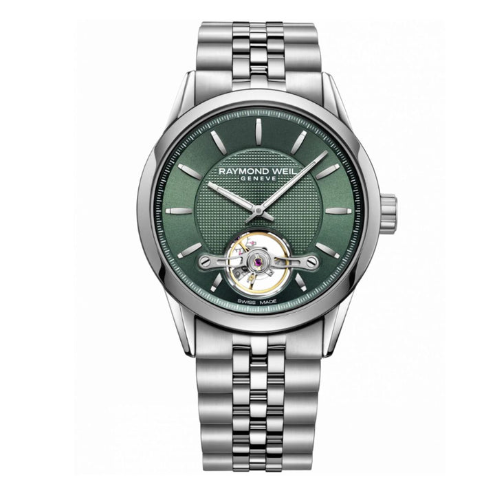 The green freelancer is completed with a RAYMOND WEIL’s stainless steel folding clasp with the double push-security system.