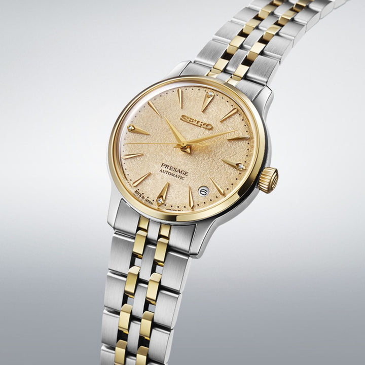 Experience refined elegance with the Seiko Presage SRPL64J, a women’s automatic watch from the Cocktail Time collection, inspired by the icy allure of a Frozen Banana Daiquiri. This 34 mm bi-tone timepiece beautifully blends style and sophistication, making it the perfect accessory for dressy occasions and everyday wear.