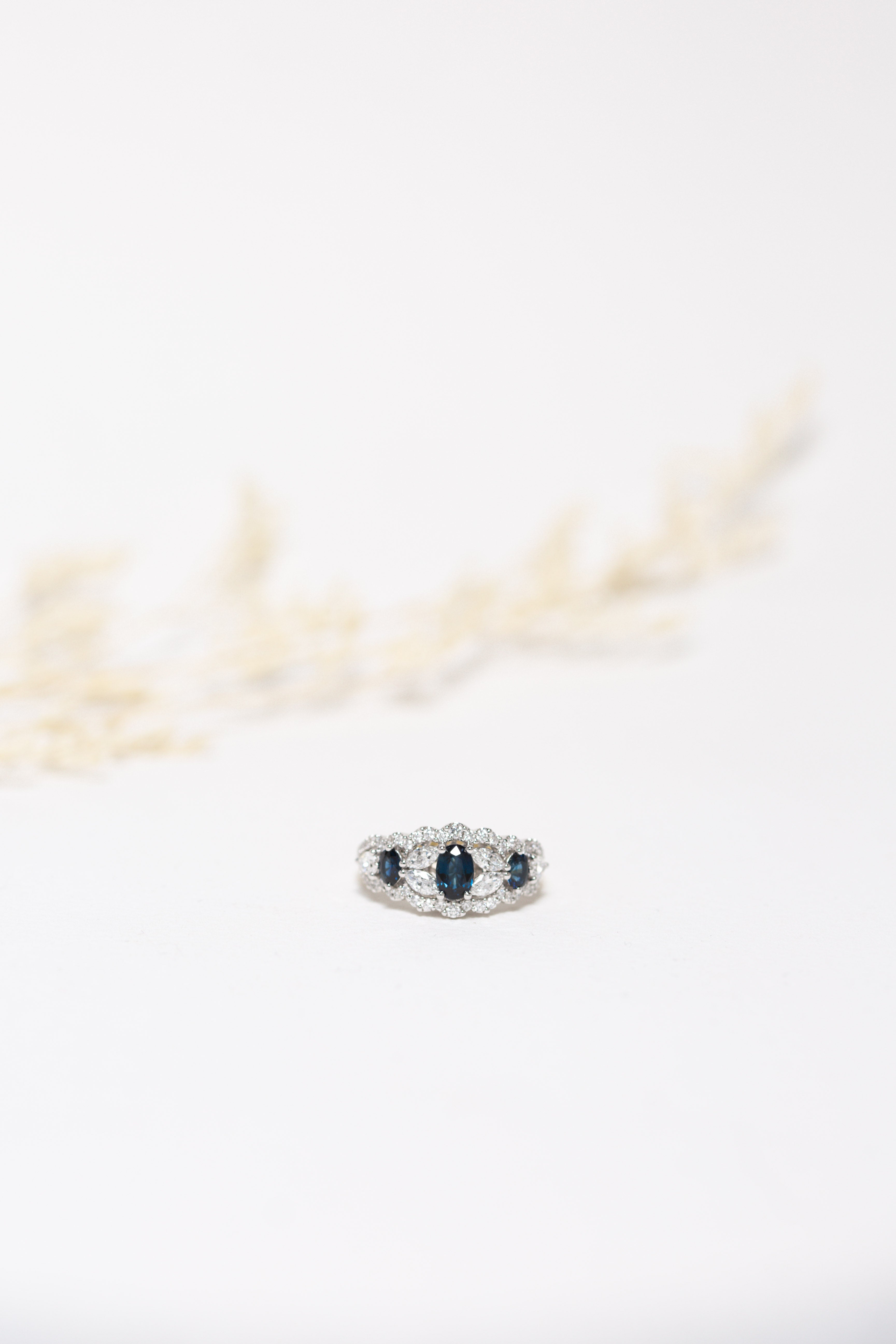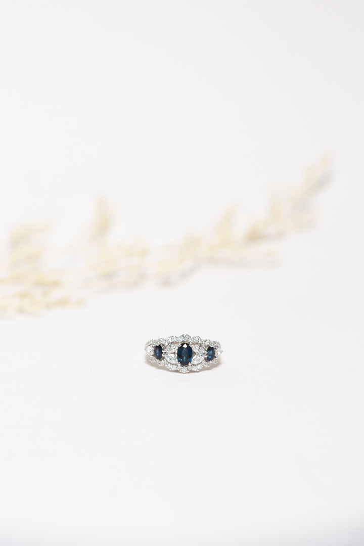 Discover timeless elegance with the Serenade Ring, a captivating piece of fine jewellery that combines royal blue hues with brilliant white sparkle. Featuring three oval-cut natural blue sapphires totaling 1.16 carats, this ring is the perfect expression of luxury and sophistication.
