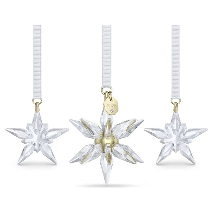 This Annual Edition 3D Ornament Set will bring light-filled magic to any festive décor. The glowing trio for 2025 is inspired by the serenity of the night sky and features an Annual Edition 3D Ornament and two Little Star ornaments. In total, the set is crafted with 773 precision-cut facets, with each piece suspended from a white grosgrain ribbon with champagne gold-tone plated accents including an engraved ‘2025’ tag on the large 3D star. A wonderful compilation of decorations to illuminate your tree or make a radiant centrepiece for your holiday celebrations. Decoration object. Not a toy. Not suitable for children under 15.