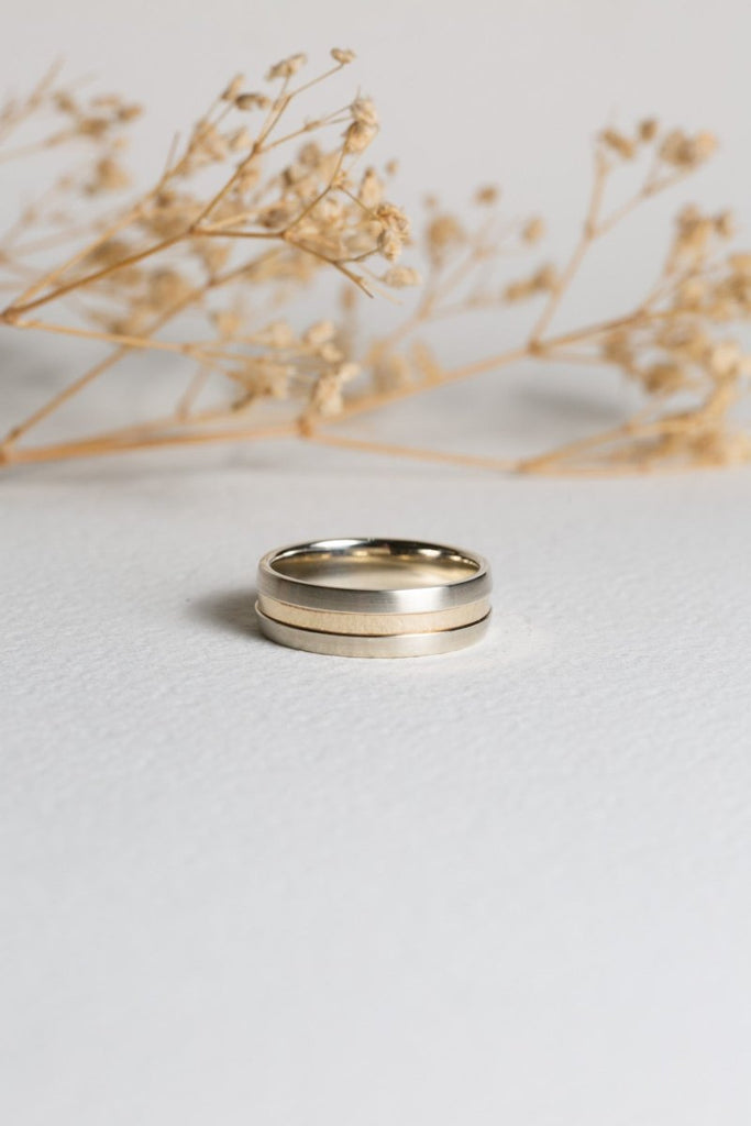 Elevate your wedding day with our modern Taj band. The 7mm wide band is expertly crafted from 9ct white gold, which has a brushed texture. A highly polished 9ct gold groove runs through the centre of the band, symbolising the unique blend of two lives joining in harmony.