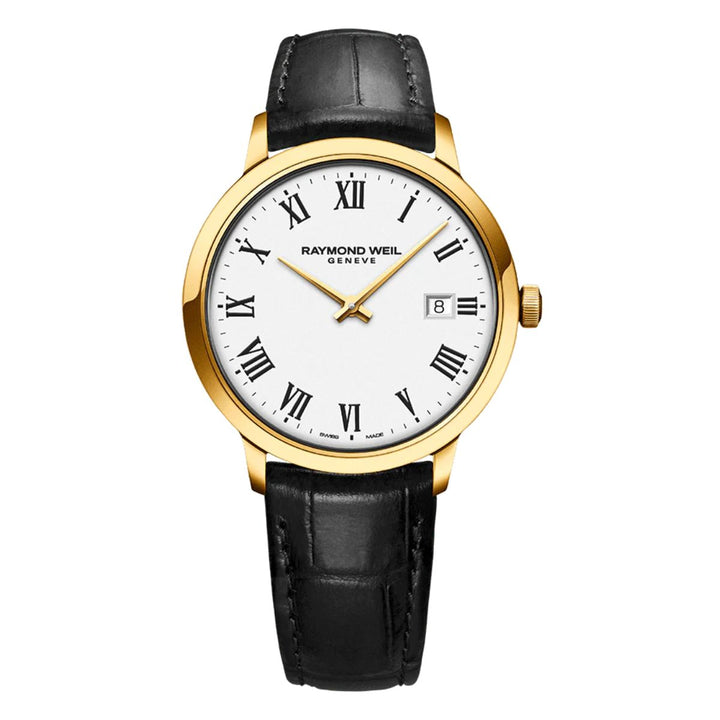 Equipped with a quartz movement, this toccata men’s gold-plated watch features a sleek stainless steel 39mm case with a date window at 3 o’clock, a classic white dial punctuated with black Roman numeral markers, and complemented by a black genuine calf leather strap with alligator motif to add a touch of warmth to this modern classic.